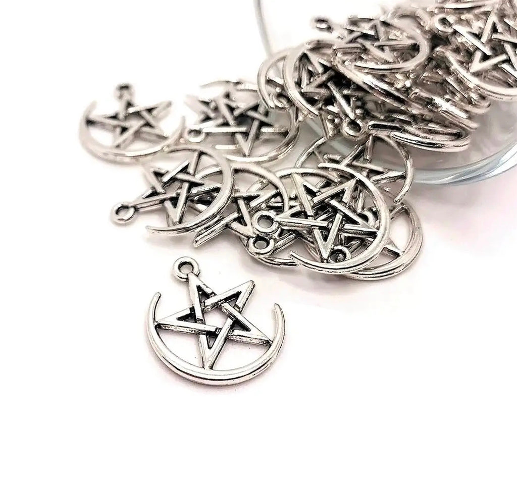 Pentagram antique silver tone charms, in a zinc alloy metal. Perfect for bracelets, pendants, earrings, zipper pulls, bookmarks, key chains, prayer beads and more!Measurements: 20mm x 14mmHole Size: 2mm.