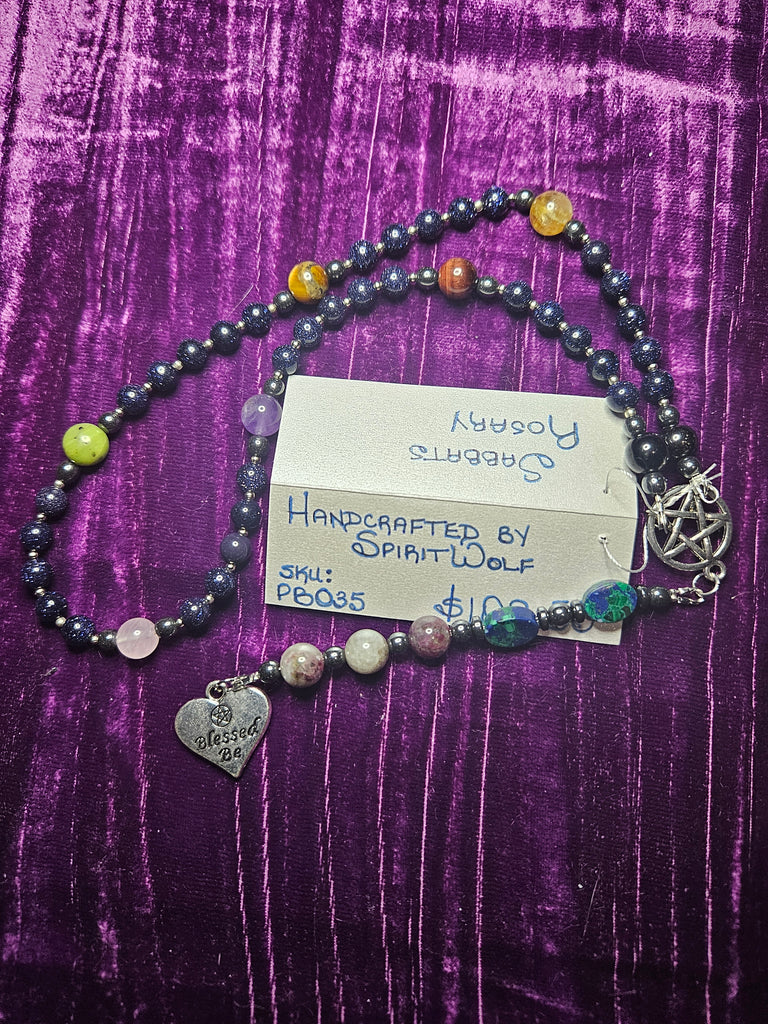 Handcrafted BY SpiritWolf Each set of my Prayer Beads are made with Tiger Tail Wire, Gemstone Beads and Pewter Charms and Pendants These Prayer Beads are made with a Blessed Be Heart and a Pentacle Also made with SAMHAIN: Black Tourmaline; YULE: Red Tiger’s Eye; IMBOLC: Amethyst; OSTARA: Rose Quartz; BELTANE: Green Jade; LITHA: Tiger’s Eye; LAMMAS: Citrine; MABON: Garnet; Also...